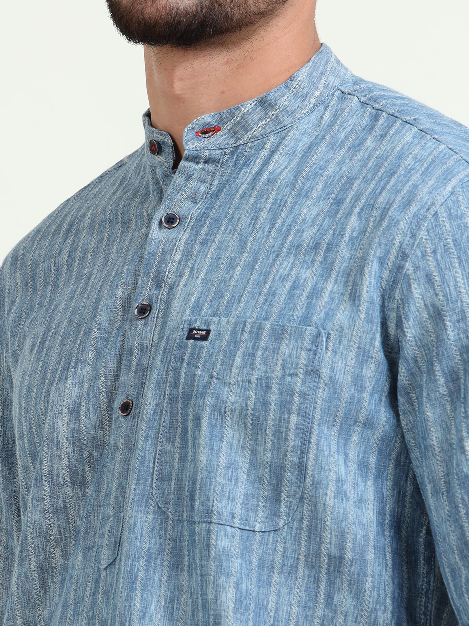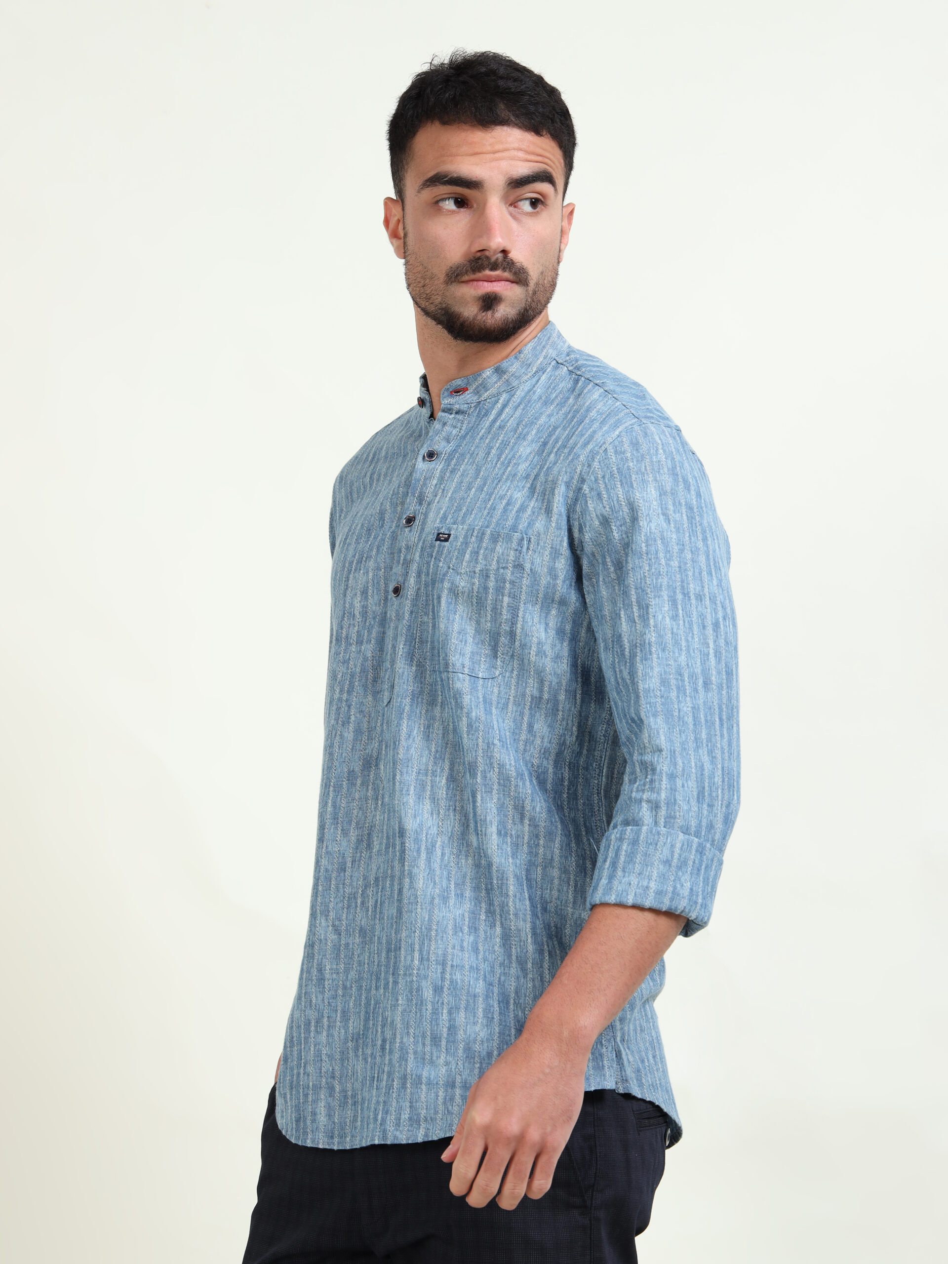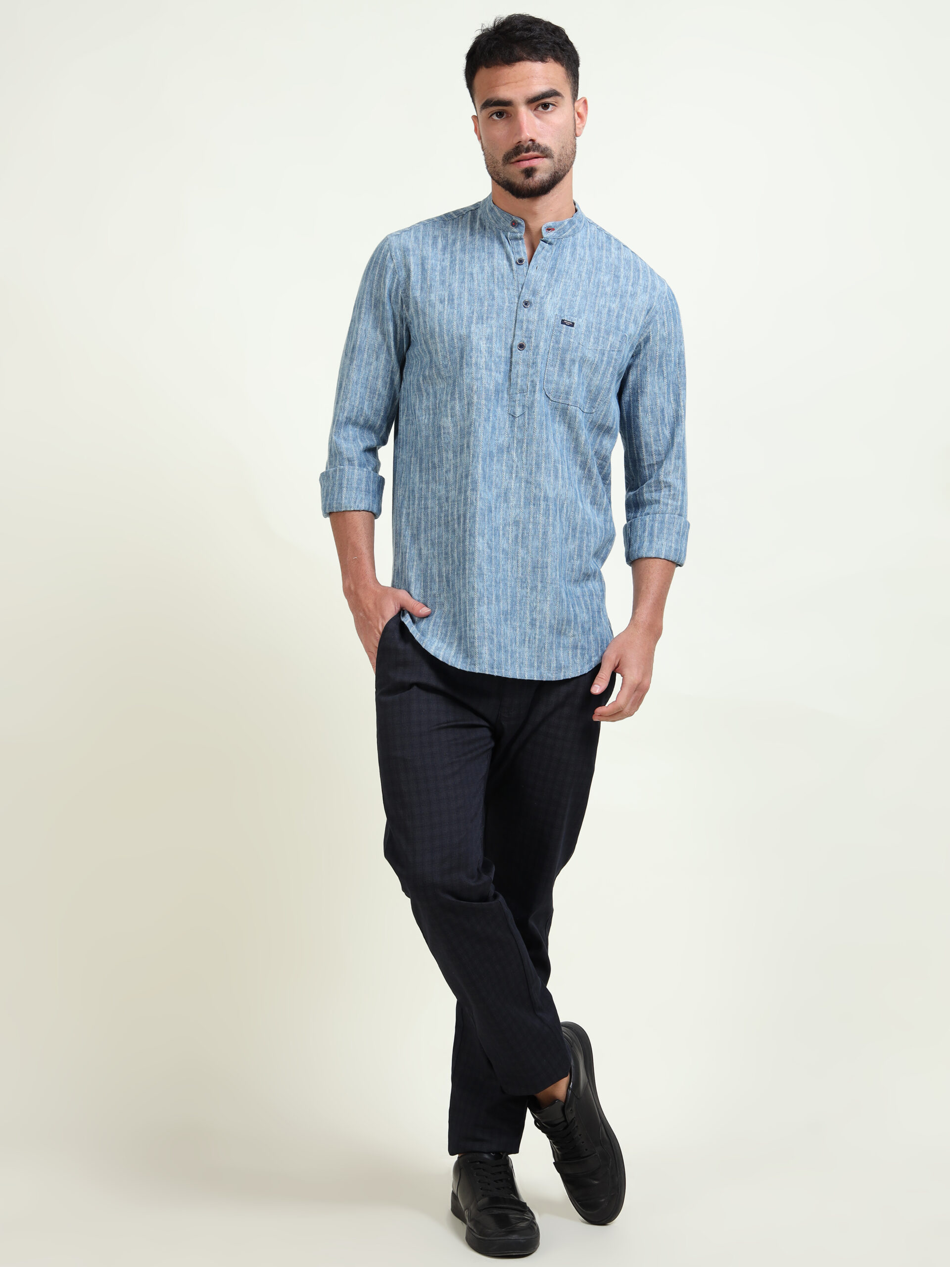 Stay stylish and comfortable with the Blue Cotton Short Kurta Shirt from Vidhi Clothing Company. Made from 100% breathable cotton, it features a modern kurta-style design, a mandarin collar, and a buttoned placket, perfect for casual and festive occasions.